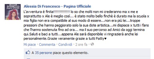 Alessia già prima della pausa natalizia era stata posta in discussione dalla sua insegnante Grazia Di Michele, la quale le aveva concesso di poter godere di alcune lezioni a domicilio da parte del maestro Galbiati. Così l’allieva era riuscita a rientrare, tramite sfida, pur con mezza classe contraria. Oggi la decisione definitiva: Alessia lascia la scuola. In fondo al post potete leggere come la pagina ufficiale Facebook della giovane di Ostia ha comunicato la notizia.