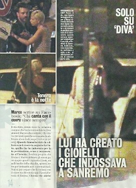 E poi mi sveglio una mattina,questa mattina… e trovo nella mia mail l’anteprima di un giornale in cui mi attribuiscono un nuovo fidanzato…ora non so quanto sia giusto dovermi giustificare con voi o meno,ma da parte mia c’è la volontà di esprimere il mio disgusto nel modo in cui parte di questo mondo specula sulla vita degli altri. Marco de Luca è un mio carissimo amico,non che colui che ha creato i miei gioielli per Sanremo e sere fa ha raggiunto me e le mie amiche per portarmi i gioielli per l’arena di Verona. Ora innanzitutto mi dispiace se questo articolo potesse in qualche modo metterlo in difficoltà con la sua vita privata..dato che ribadisco siamo amici e un BACIO SULLA GUANCIA e un abbraccio non significa avere una nuova storia. Quindi amici miei prepariamoci al fatto che da adesso in poi ogni volta che mi fotograferanno in compagnia di esseri viventi,oggetti non identificati,specie protette,e chi più ne ha più ne metta… saranno comunque tutti o tutte miei fidanzati/e…e che dire…votatemi come si deve a Verona..perchè vi ripeto..tutto il resto è noia…e in certi casi anche “monnezza”…vvb