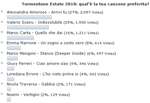 Alle ore 12 è stato chiuso ufficialmente il sondaggio sul tormentone estivo del 2010. I nostri fedelissimi lettori hanno decretato Arrivi Tu di Alessandra Amoroso con 2097 voti), il pezzo che ha accompagnato le loro vacanze.