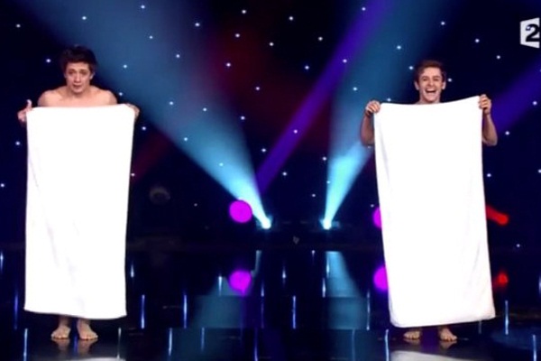 Si tratta di Les Beaux Freres, due artisti francesi che si sono esibiti su France 2 per Le Plus Grand Cabaret Du Monde. Sono arrivati sul palco completamente nudi, lasciando il pubblico spiazzato, coperti solo da un asciugamano da far girare e rigirare sapientemente per tutta la durata dell’esibizione.