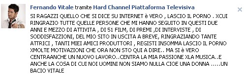 Si ragazzi quello che si dice su internet è vero, lascio il porno. Per cui ringrazio tutte quelle persone che mi hanno seguito in questi due anni e mezzo di attività, di 51 film, di premi, di interviste, di soddisfazzioni, del mio sito in uscita a breve, ringraziando tante attrici, tanti miei amici produttori, registi insomma lascio il porno per molte motivazioni che ora non sto qui a dire… ma si è vero c’entra anche un nuovo lavoro… c’entra la mia passione per la musica… e anche la cosa di cui noi uomini non siamo nulla cioè una donna… un bacio Vitale.