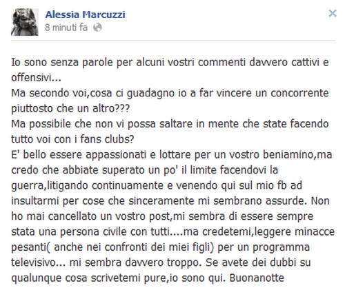 Io sono senza parole per alcuni vostri commenti davvero cattivi e offensivi… Ma secondo voi,cosa ci guadagno io a far vincere un concorrente piuttosto che un altro??? Ma possibile che non vi possa saltare in mente che state facendo tutto voi con i fans club? E’ bello essere appassionati e lottare per un vostro beniamino,ma credo che abbiate superato un po’ il limite facendovi la guerra, litigando continuamente e venendo qui sul mio fb ad insultarmi per cose che sinceramente mi sembrano assurde. Non ho mai cancellato un vostro post,mi sembra di essere sempre stata una persona civile con tutti….ma credetemi,leggere minacce pesanti (anche nei confronti dei miei figli) per un programma televisivo… mi sembra davvero troppo. Se avete dei dubbi su qualunque cosa scrivetemi pure,io sono qui. Buonanotte
