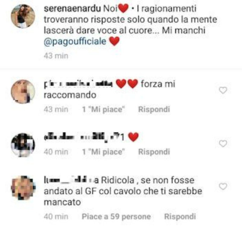 Serena Enardu e le dediche social per Pago