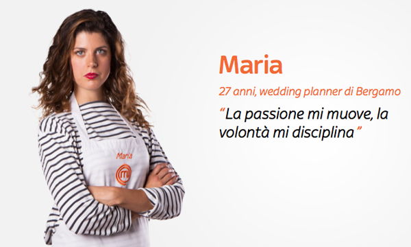 Bergamasca, 27 anni, Maria è tra i concorrenti di Masterchef 4 che si sfideranno a colpi di esperimenti tra i fornelli per aggiudicarsi la vittoria nel talent show culinario che vede Joe Bastianich, Bruno Barbieri e Carlo Cracco in giuria.