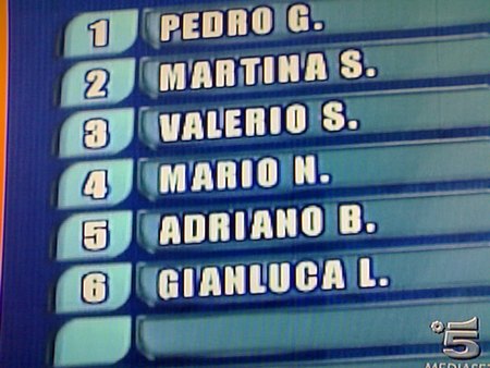 Continua la registrazione di ieri. Anche per i Bianchi vale la possibilità di scoprire gli schieramenti dei Blu e proporre, per una sola sfida, la sostituzione del titolare degli avversari con la riserva. Tutti però sono abbastanza soddisfatti e non chiedono alcun cambiamento. Solo Gianluca avrebbe voluto confrontarsi con Pedro nel passo a due di Steve, piuttosto che con Daniela. Valerio, maliziosamente, gli consiglia di lasciare tutto così: con Daniela come avversaria sarà più facile vincere…