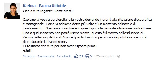 La pagina ufficiale di Karima ha postato un breve comunicato per spiegare tutti i fan sulla sua esclusione dall’Amici 2012 compilation in uscita oggi su iTunes e tutti i negozi digitali: